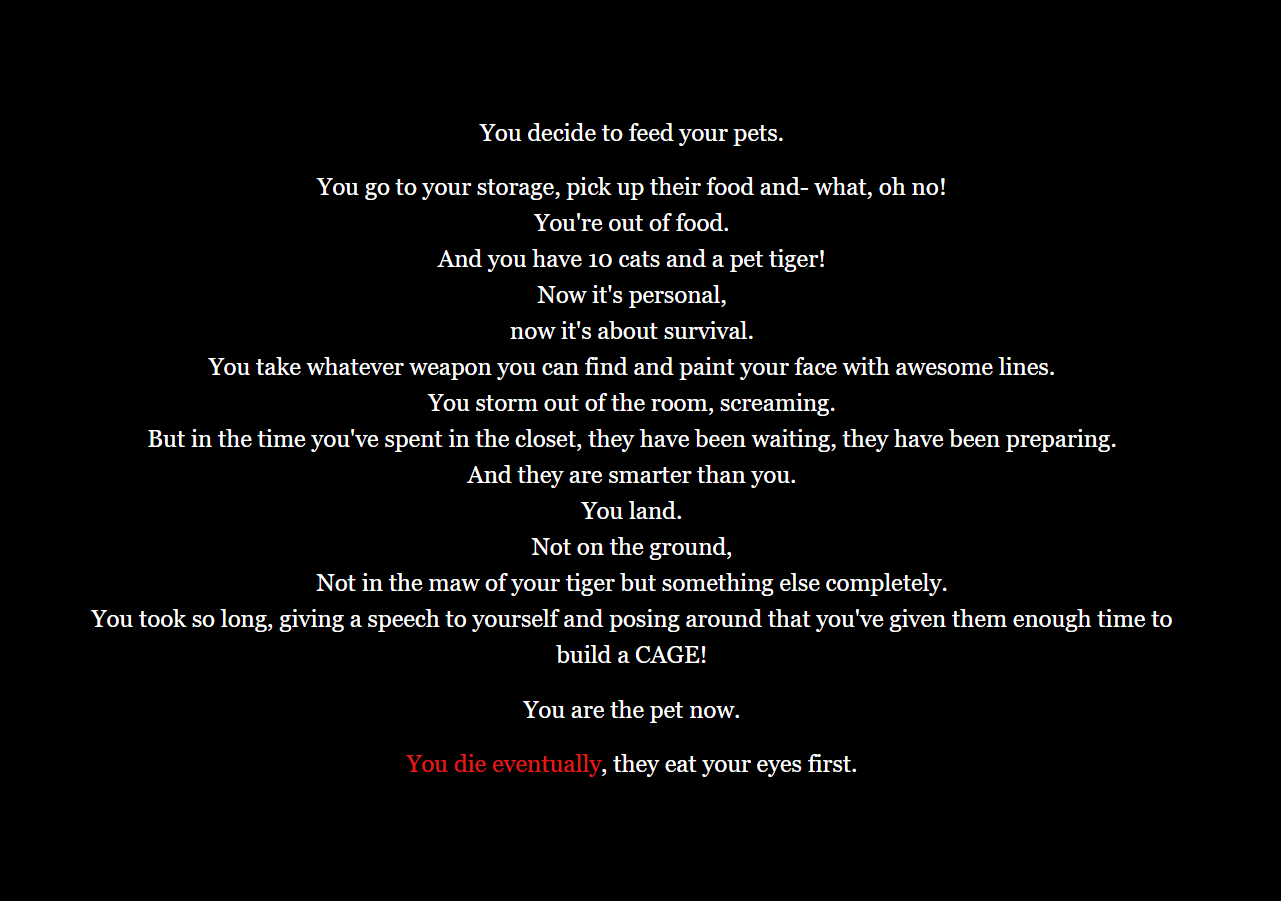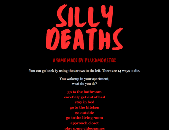 Short text based game about all the silly ways you could die. It doesn't even matter if you get out of bed or not! Leave? Nope! Breathe? Nope!